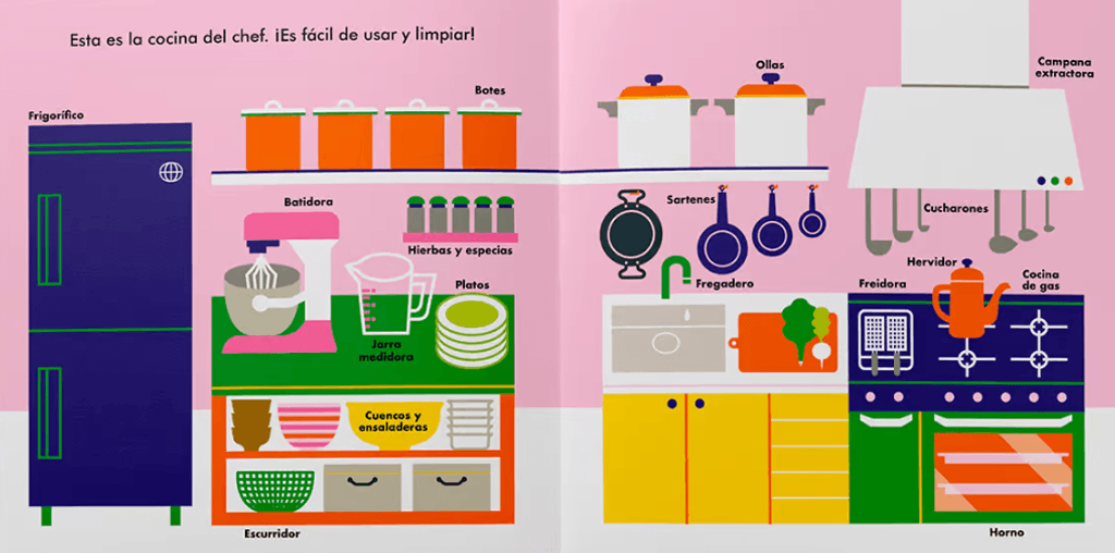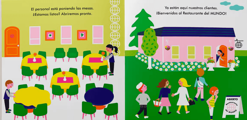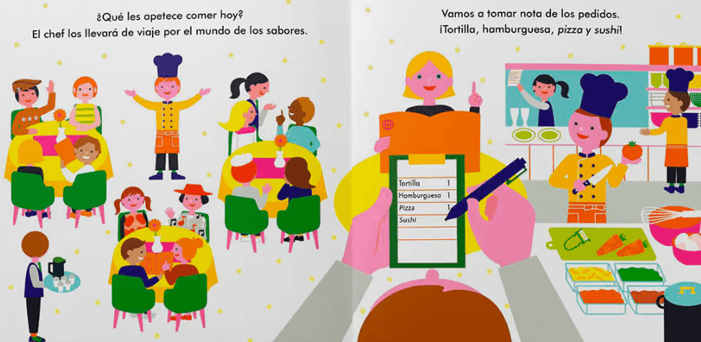 Este libro interactivo presenta un pequeño restaurante donde los niños pueden «cocinar» y atender con personajes y recetas divertidas. Sirven sopas, postres y platos imaginarios utilizando las pegatinas para completar las escenas. A través del juego, descubre sabores, ingredientes y hábitos saludables mientras exploran su creatividad y desarrollan habilidades motrices.