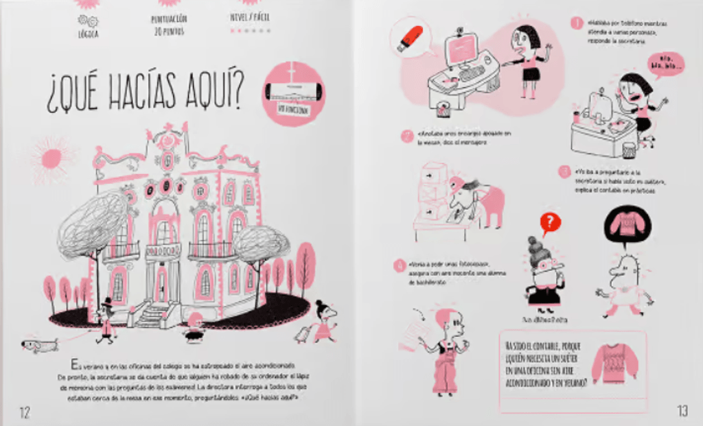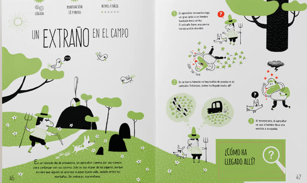 Una colección de 25 enigmas visuales e interactivos para despertar el ingenio. Algunos se resuelven mediante lógica, otros gracias a la imaginación. Cada reto viene acompañado de pistas, sistemas de puntuación por niveles de dificultad y espacio para jugar solo, en familia o en grupo. Una propuesta que combina diversión, razonamiento y trabajo en equipo. Ideal para mentes curiosas y detectives en formación.