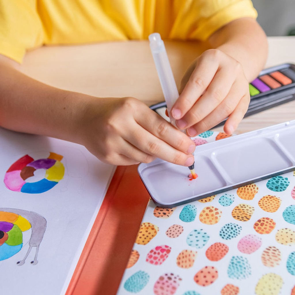 Set creativo de pintura portátil diseñado para que los niños pequeños exploren el mundo del arte de forma divertida y segura. Incluye páginas especiales e instrumentos para pintar fácilmente, permitiéndoles colorear, descubrir colores y desarrollar su imaginación mientras disfrutan de una actividad creativa.